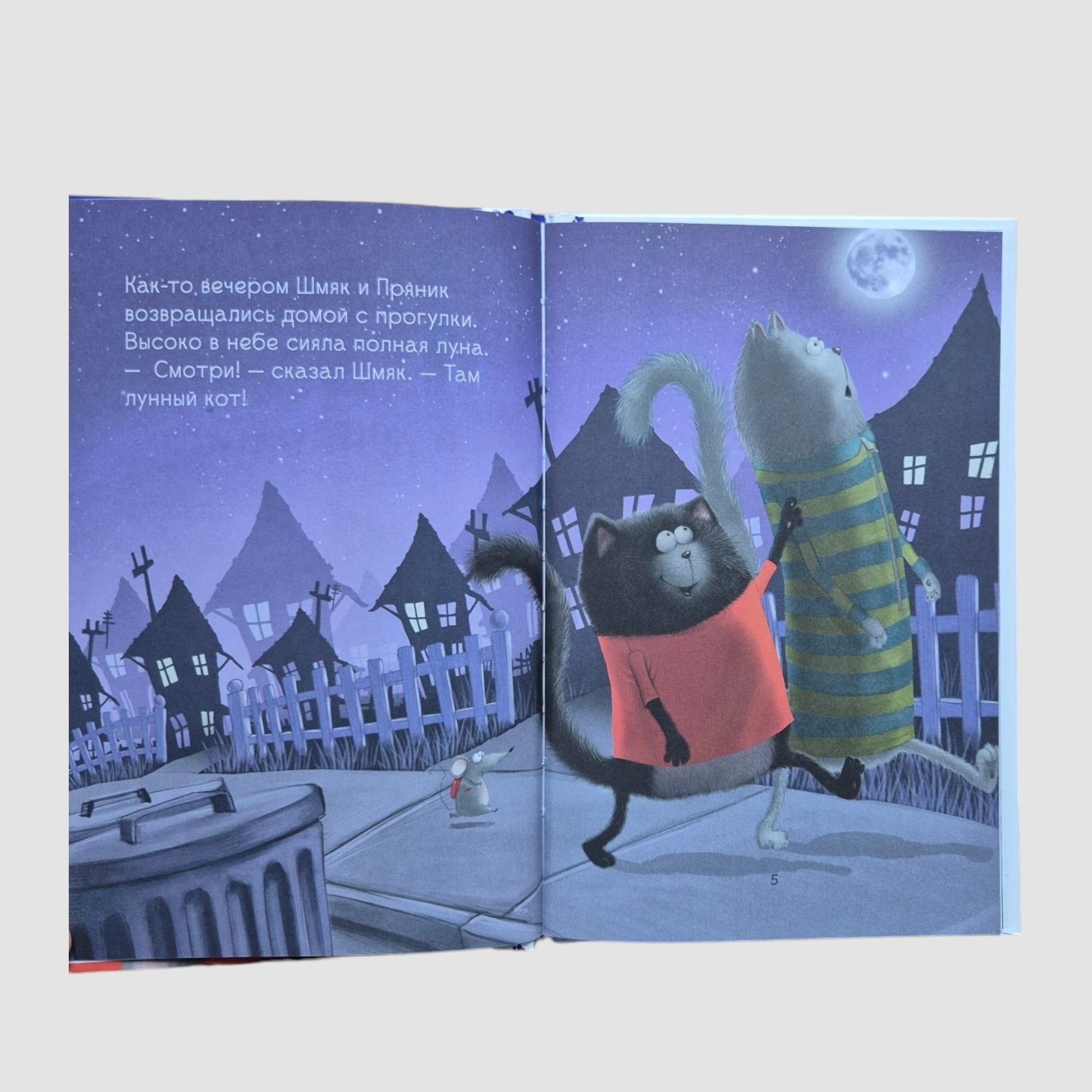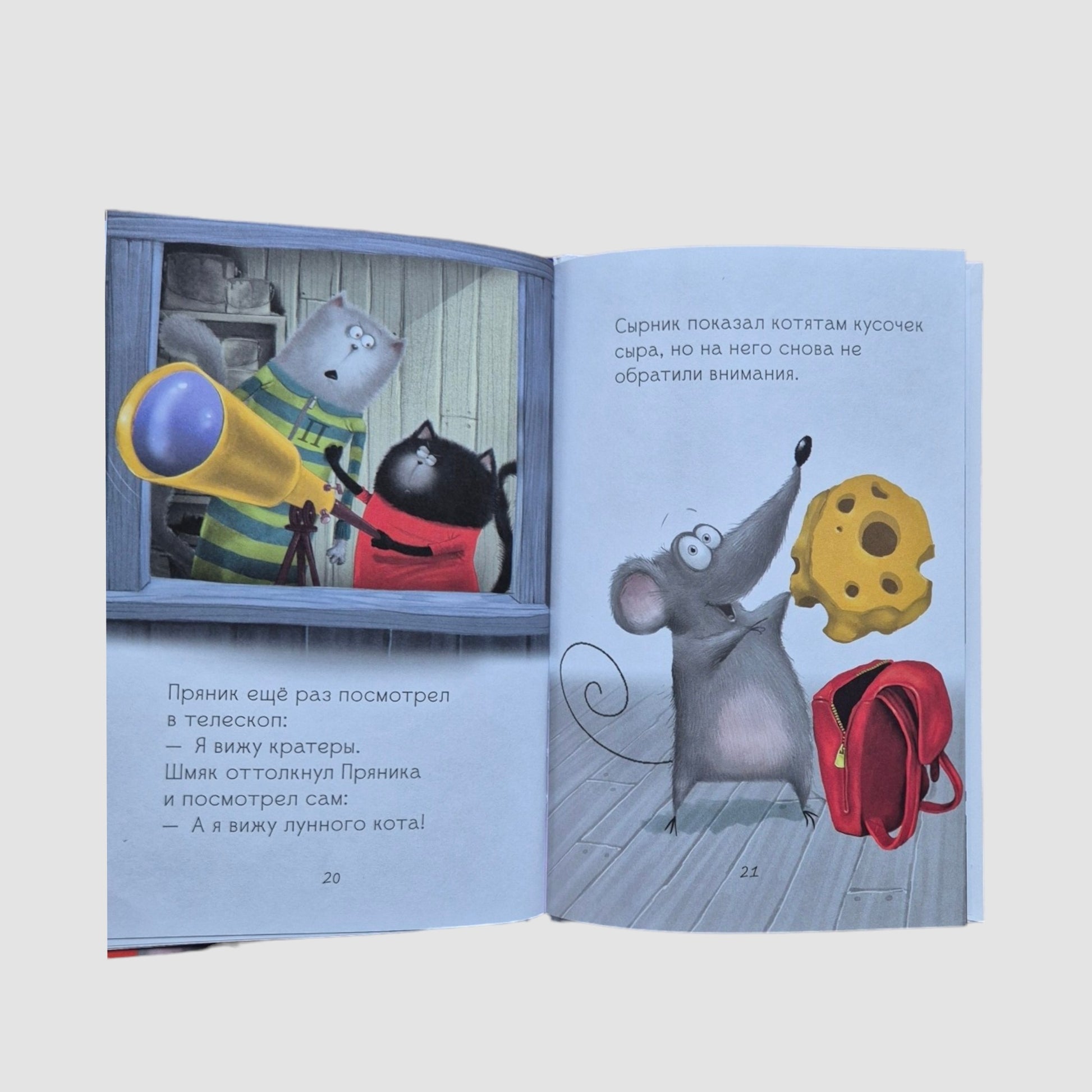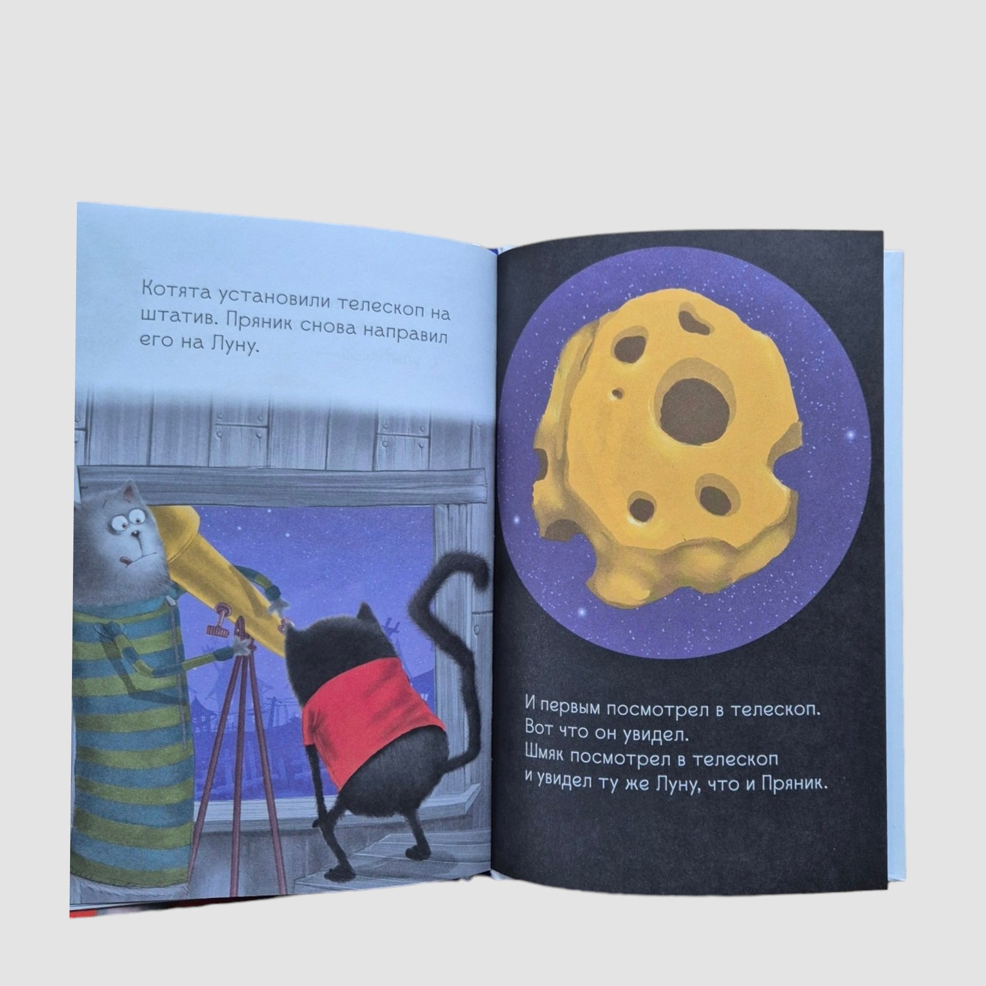 Однажды котенок Шмяк и его друг Пряник поспорили. Один был уверен, что с Луны на них смотрит лунный кот, а второй доказывал, что это кратеры от метеоритов. Кто прав? И что сделает мышонок Сырник в этой непростой ситуации?
