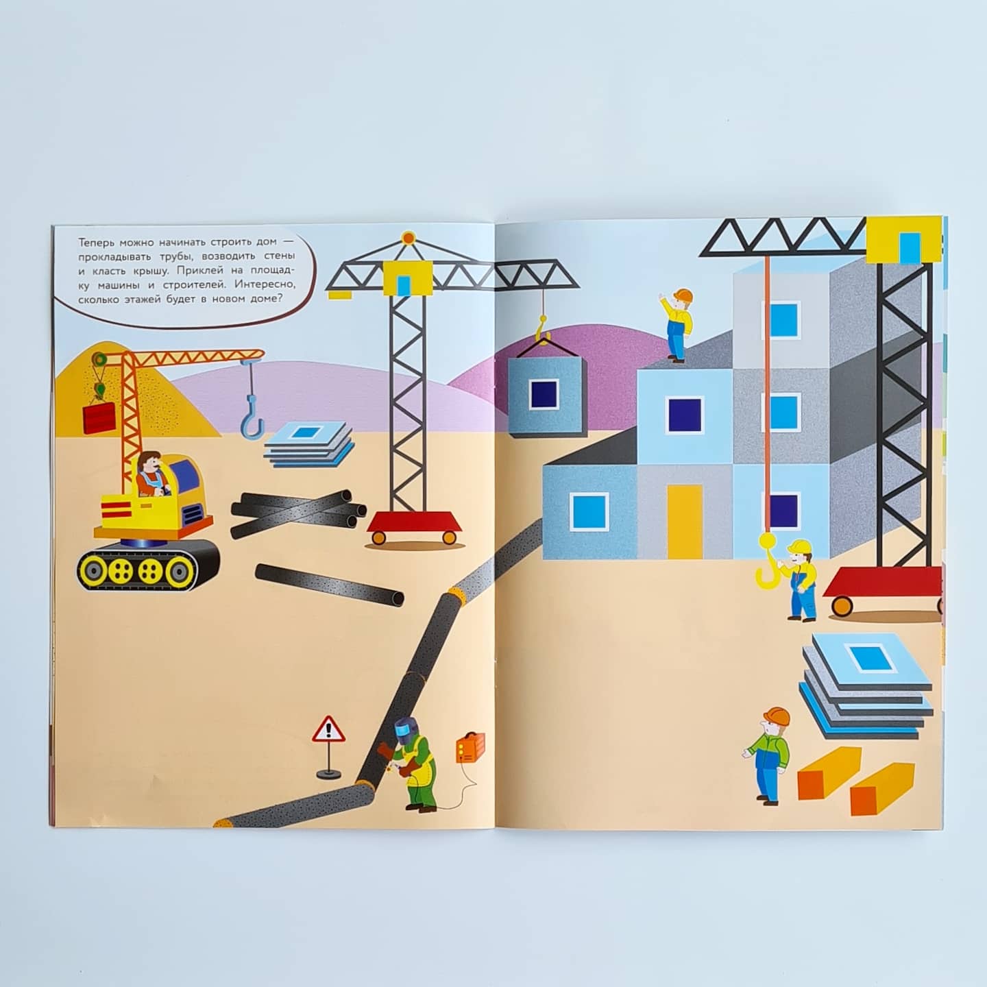 Ребенок любит строительную технику? Тогда скорее открывайте нашу книжку, приклеивайте на стройплощадку машины и стройте новый дом! С нашими яркими наклейками это так интересно!