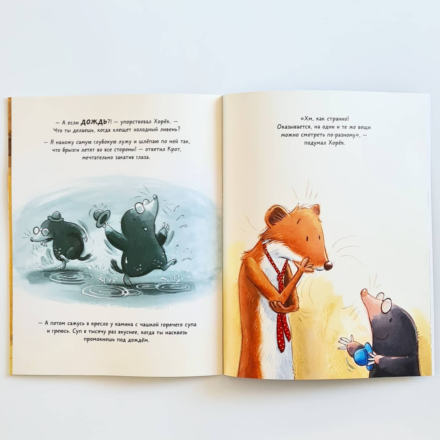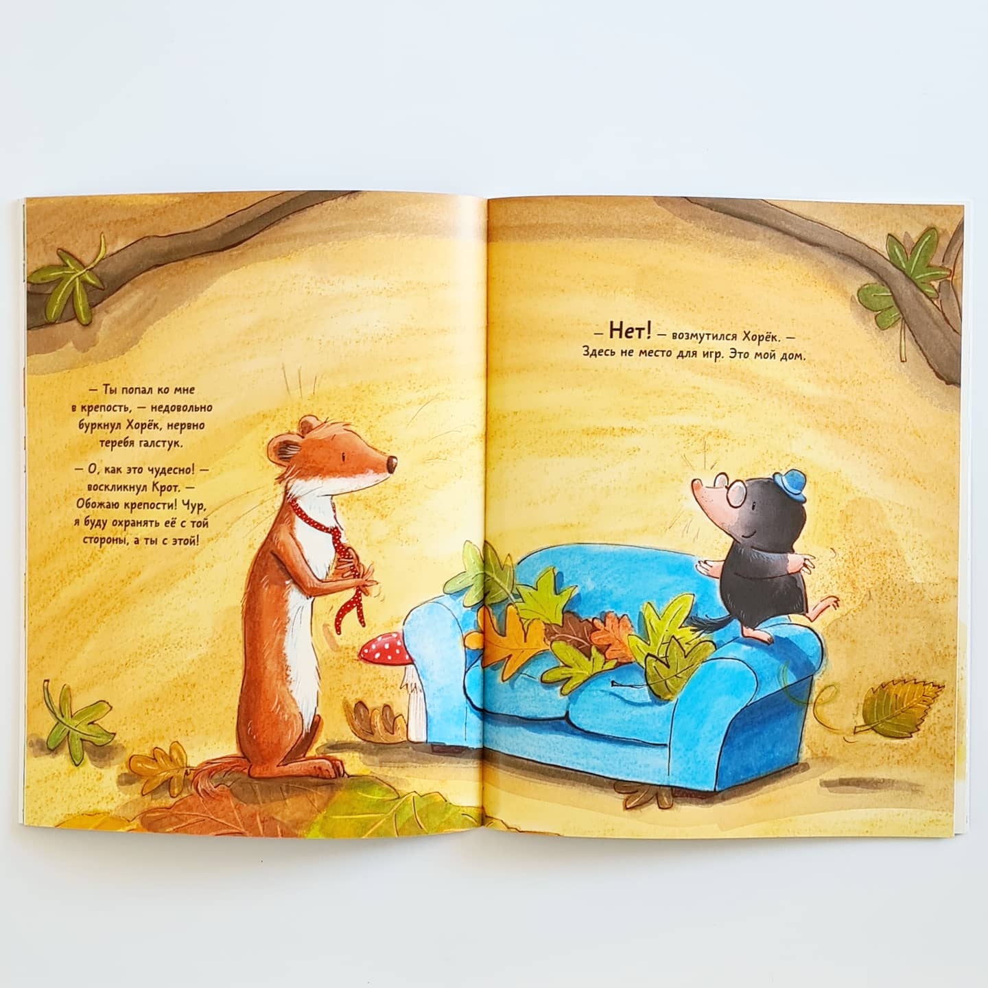 Жил в лесу Хорёк, жил не тужил — гулял, собирал осенние листья и улыбался. Но однажды он попал в сильную бурю и так испугался ветра, дождя и града, что построил себе дом-крепость и решил больше никогда не выходить на улицу. Так бы и провел он остаток жизни взаперти и в тоскливом одиночестве, если бы к нему в дом случайно не проник жизнерадостный Крот — большой любитель поиграть. Но Хорьку было не до веселья, ведь он прятался от злой страшной бури. Он поделился своими страхами с Кротом и каково же было его удивление, когда оказалось, что Крот любит играть в снежки, шлепать по лужам и кружиться на ветру, и что ни капельки не боится бури. А если ему становится страшно, что, конечно, с ним тоже иногда случается, он берет друга и они вместе шагают навстречу опасности.