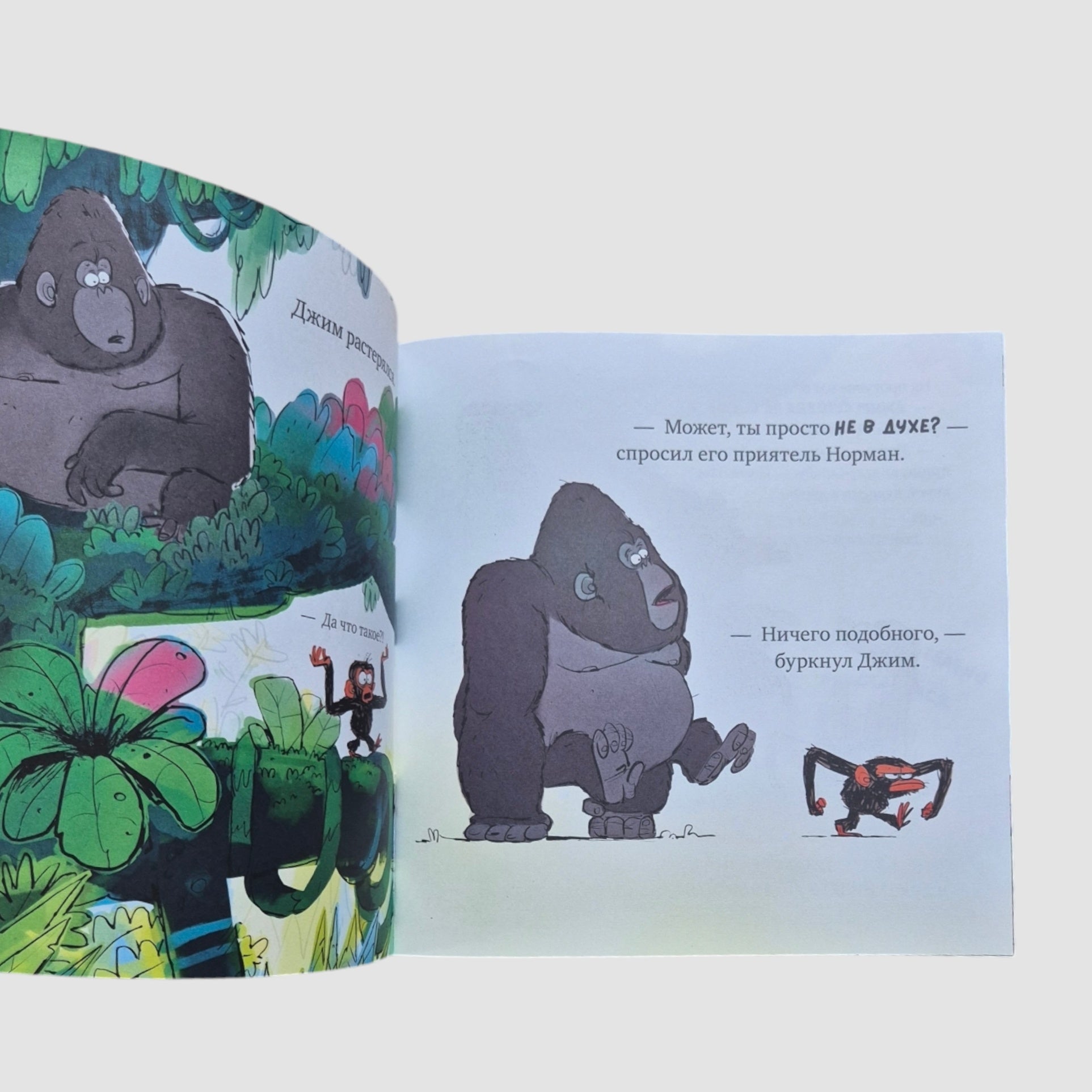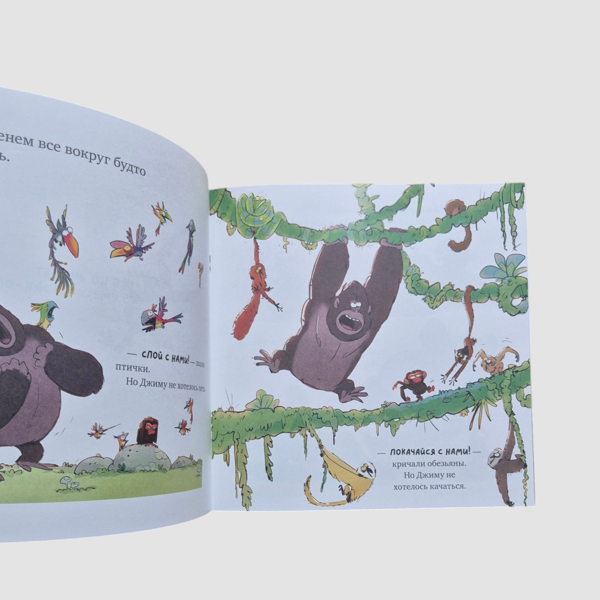 Однажды Джим проснулся в ужасном настроении без всякой на то причины. И небо было слишком синим, и солнце слишком ярким, и даже бананы были слишком сладкими. Его друзья не могут понять, ведь сегодня ТАКОЙ прекрасный день! Один за другим они дают ему советы, что нужно сделать: попрыгать, потанцевать, спеть, поваляться на травке… Но Джиму становится только хуже. Возможно, ему просто нужен один день, когда он может побыть не в духе? Возможно, сегодня отличный день, чтобы просто погрустить?