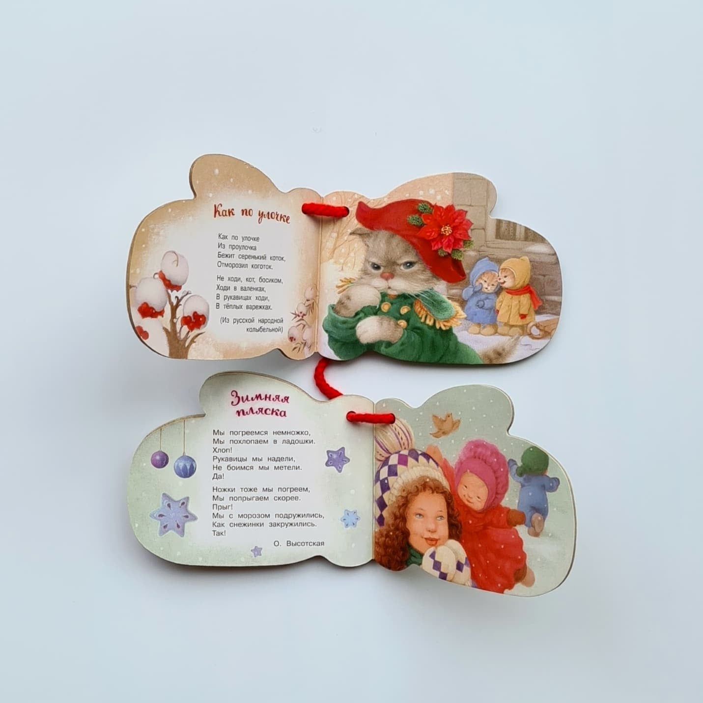 Две книжки соединены шнурочком, они так похожи на настоящие вязаные варежки, которые были у каждого в детстве!