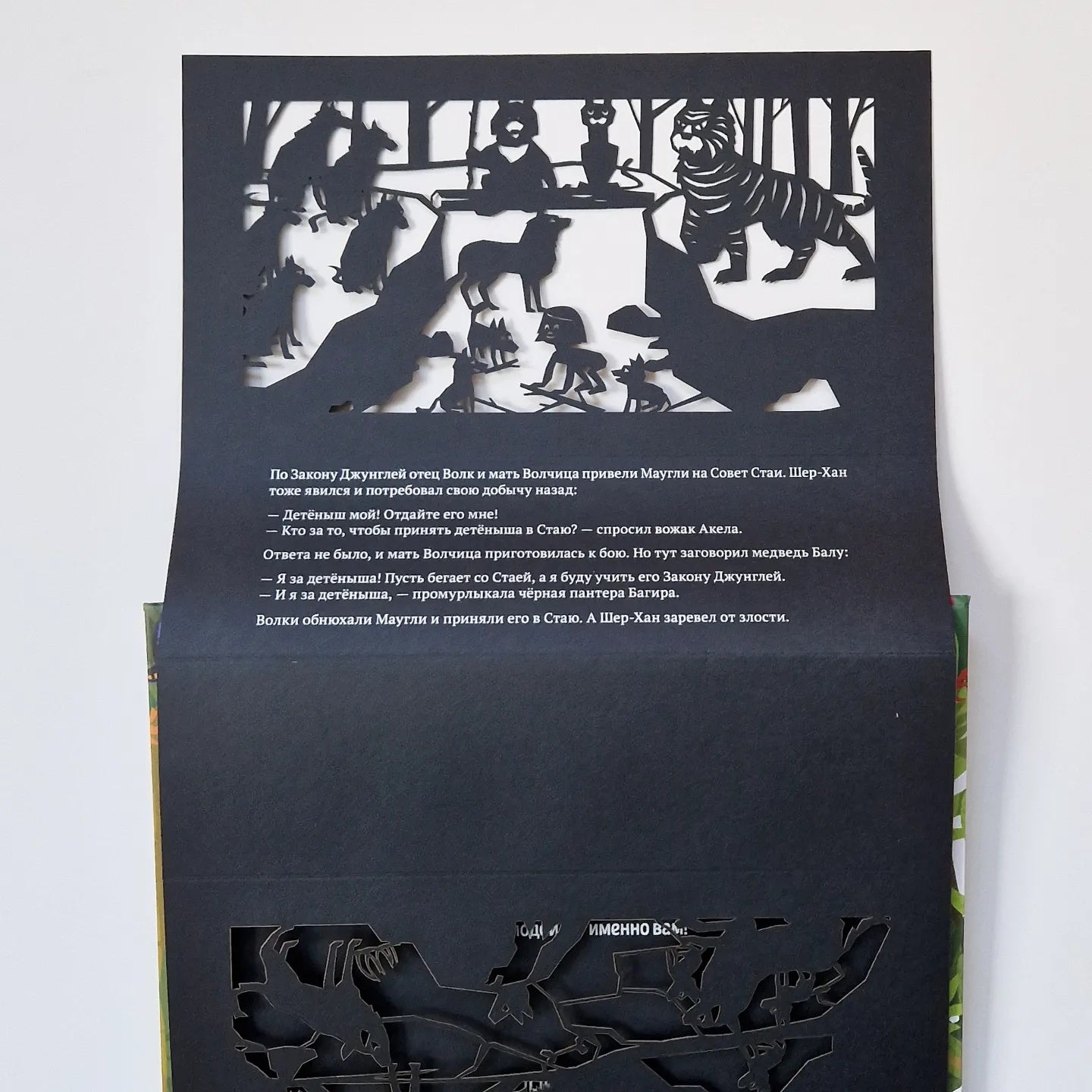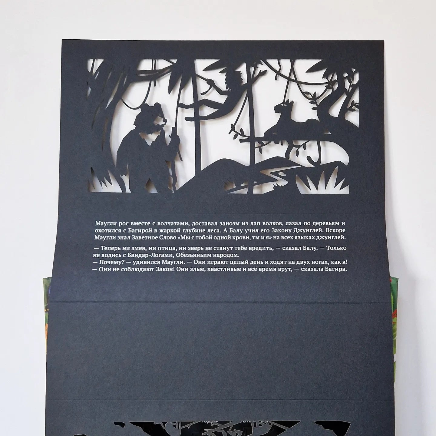 В книге 9 страниц с вырезанными лазером иллюстрациями с текстом под ними, которые подробно раскрывают сюжет сказки.