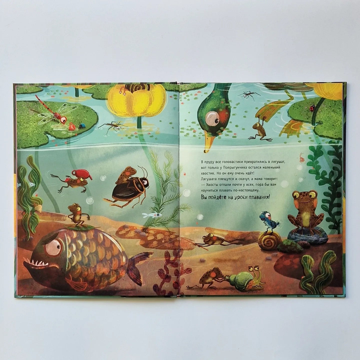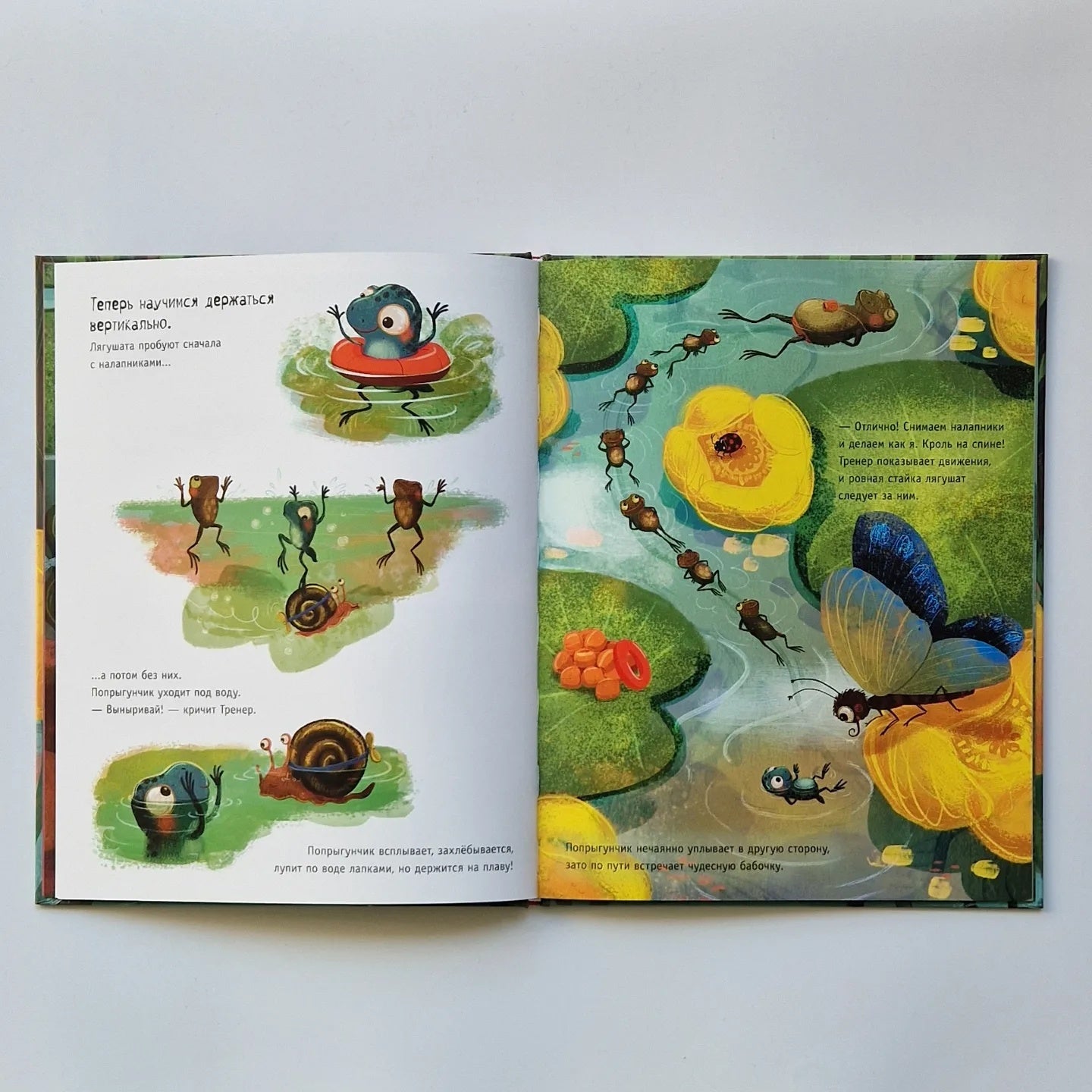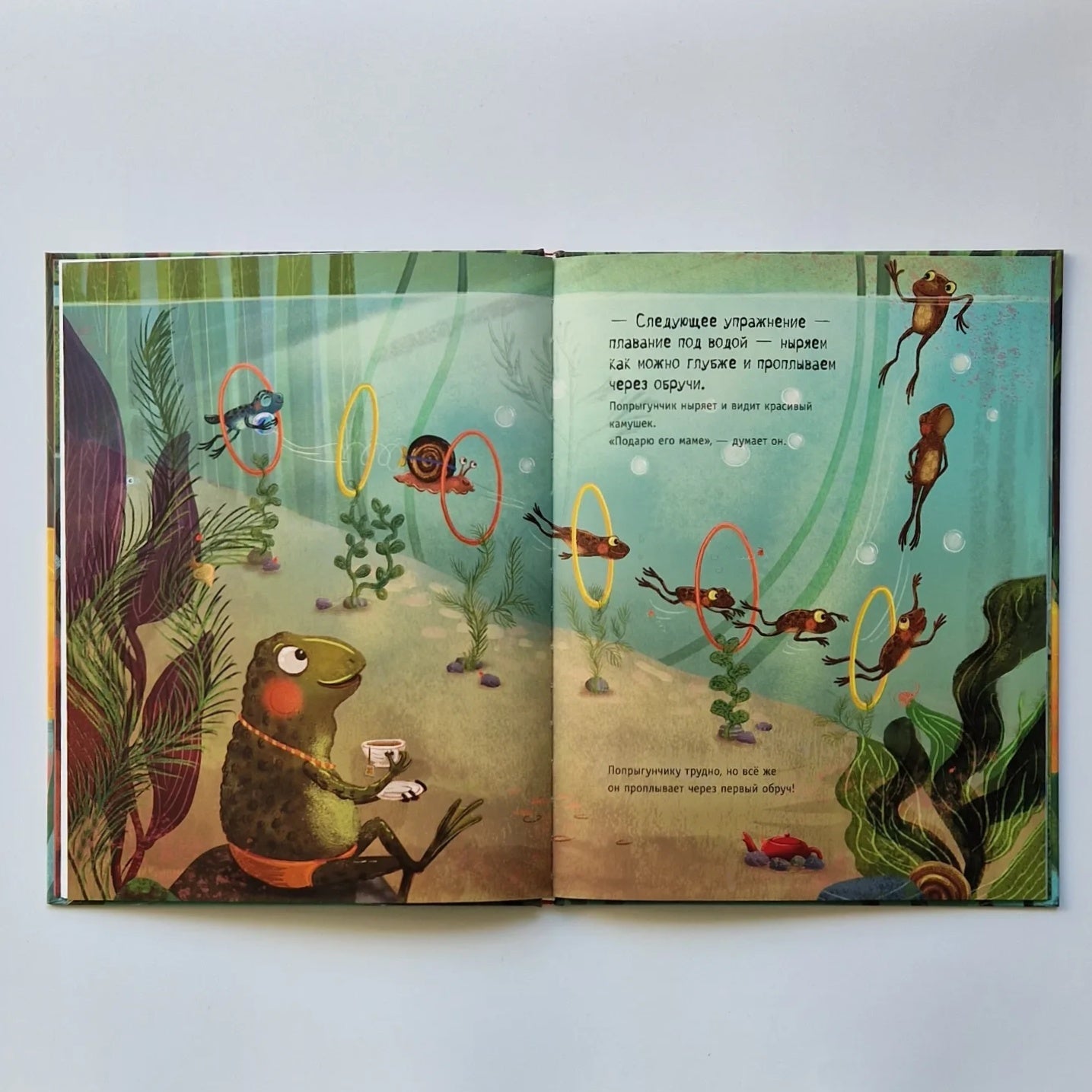 Плюх! Все головастики превратились в лягушат. Им пора брать уроки плавания. У малыша Попрыгунчика получается далеко не всё, но он очень храбрый и очень старается. А значит, скоро Попрыгунчик научится нырять, прыгать и даже плавать в костюме!