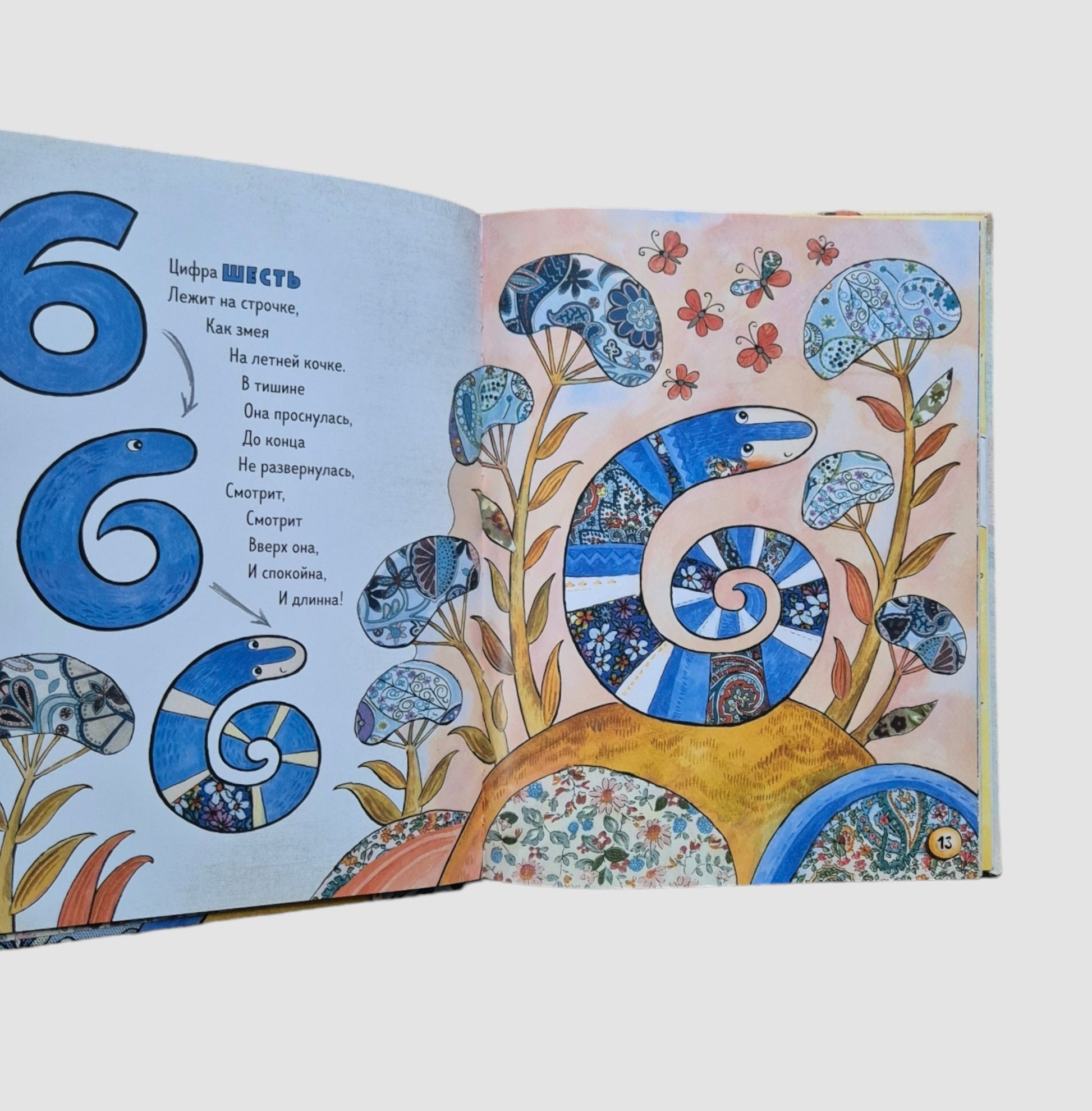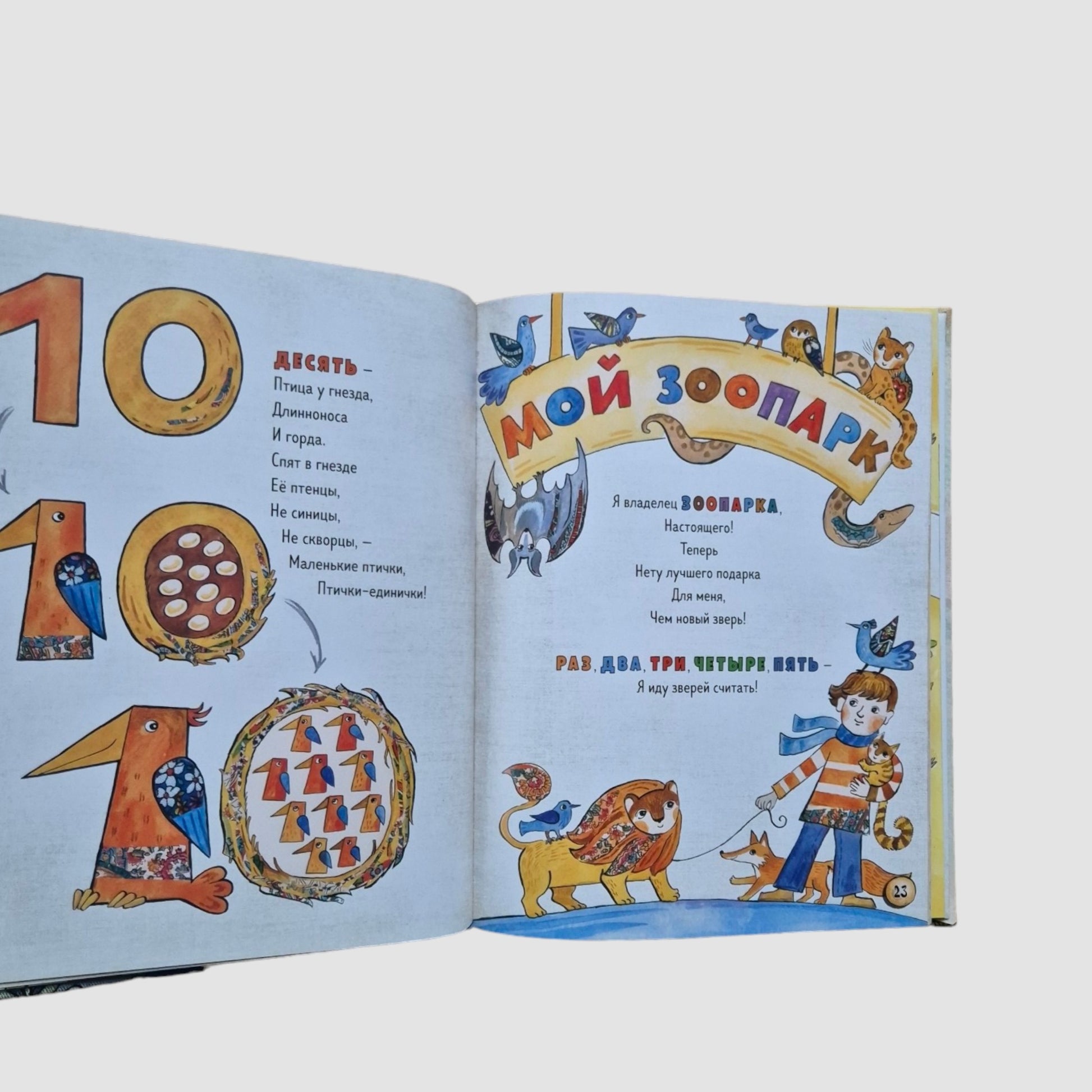 А ещё книга учит счёту от 1 до 100: считать можно слонов и носорогов, черепах, улиток и даже микробов. И не только считать, но и читать о них в стихах и выполнять задания, например, искать сердитых рыб, лягушку в очках или кенгуру в короне.