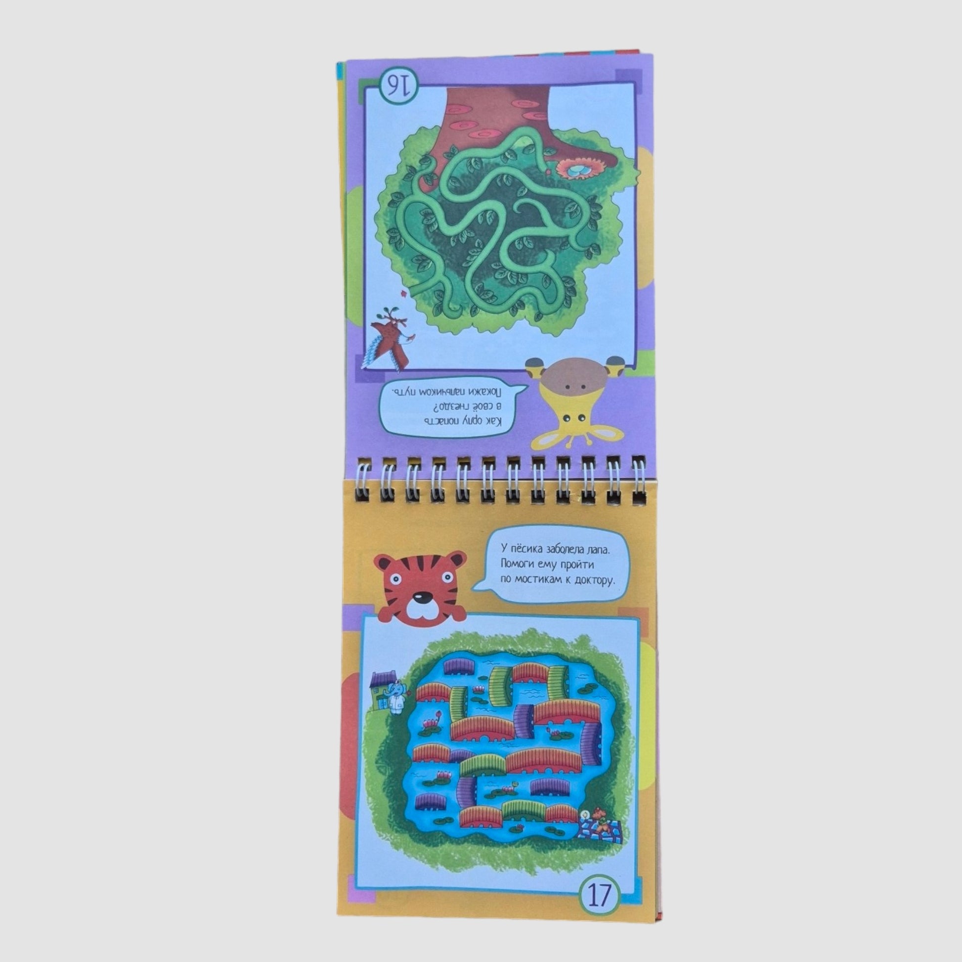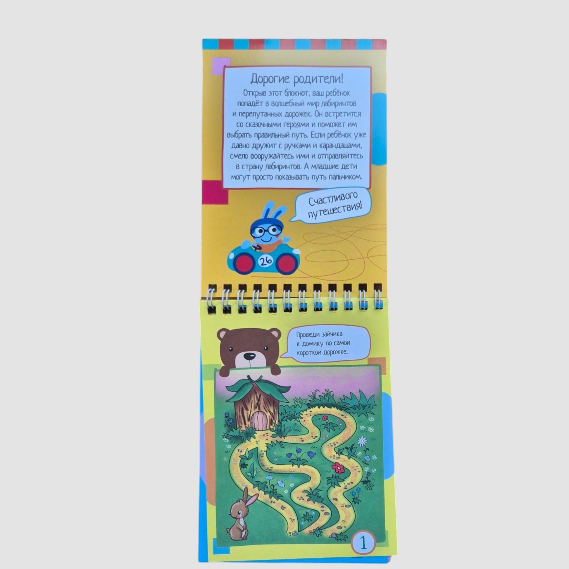 Открыв этот блокнот, ребёнок попадёт в волшебную страну лабиринтов. Вооружившись карандашом, он будет искать выходы из тупиков, распутывать переплетённые дорожки и одновременно развивать внимание, мелкую моторику и мышление. Младшие дети могут показывать путь пальчиком. В дороге или на отдыхе такой блокнот будет просто незаменим.
